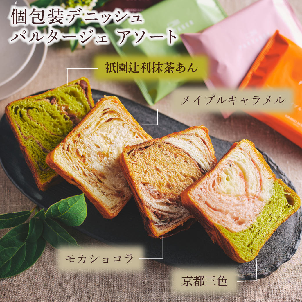 アソートには、「京都三色」「メイプルキャラメル」「祇園辻利抹茶あん」「モカショコラ」が各1枚ずつ入っています。