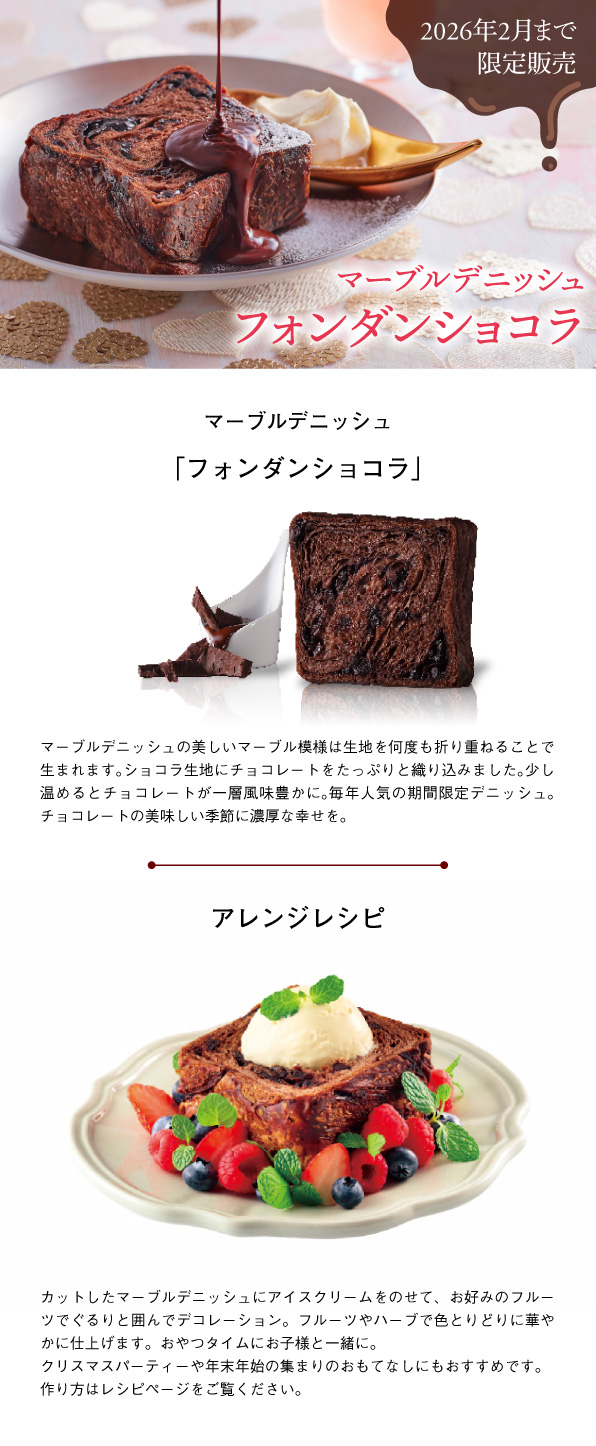 たっぷりのショコラを練りこんだデニッシュ生地にチョコレートをプラス。あたためるとチョコレートがとろ~っととろけ、さらに濃厚なおいしさに。